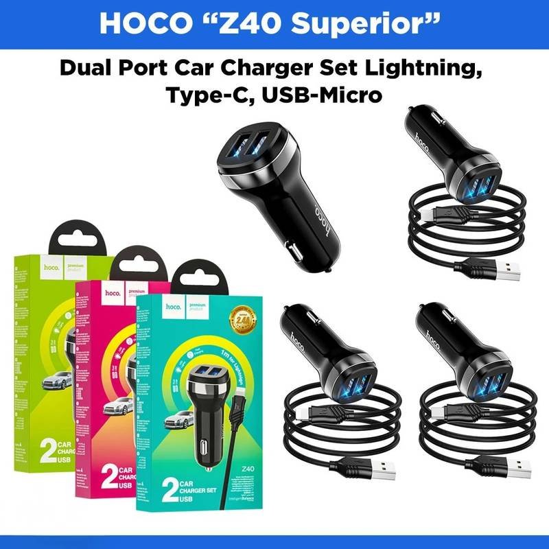 HOCO “Z40 Superior” Dual Port Car Charger Set Lightning, Type-C, USB-Micro